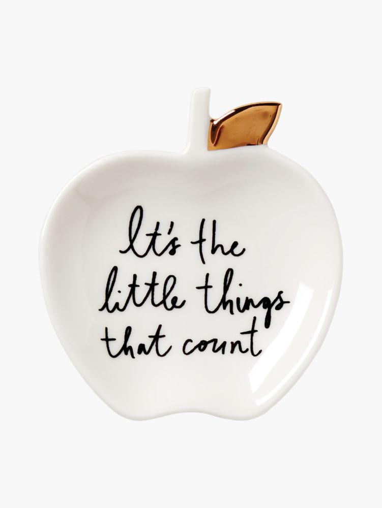 Here's a special dish you can use to catch your rings, earrings, bracelets…anything you want, really. We made it from smooth porcelain in the shape of an apple and added some wise words worth reading every day: it's the little things that count.