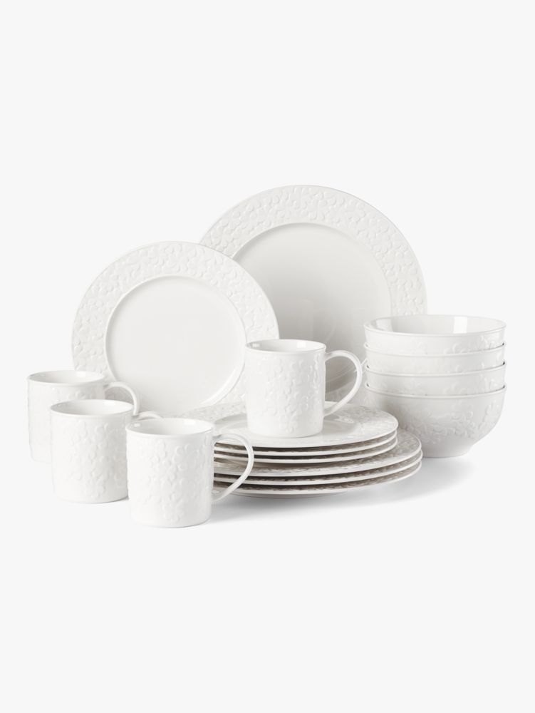 this sixteen-piece place setting nods to one of our absolute favorite things: flowers! see how they're delicately carved into the porcelain?