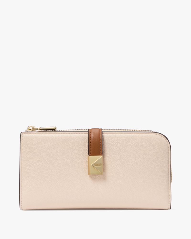 Perennially chic with luxe finishing touches, our Deco collection features elevated staples for both everyday and special occasions. This slim compact wallet is made from colorblocked pebbled leather with our new K hardware inspired by Art Deco style.