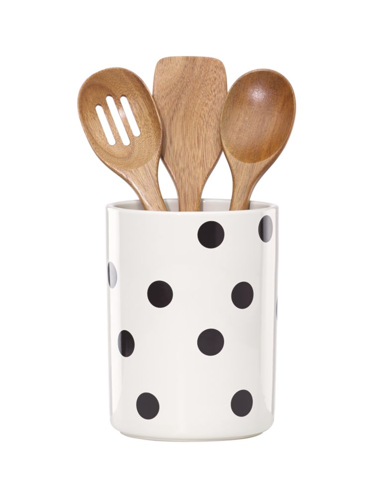 This is my first Kate Spade home item and I could not be happier. It's a large utensil holder with 3 matching wooden spoons so I can ditch my random kitchen items. The holder is stylish and is easy to match with other items. Well packaged for shipping; I'm very happy that I own this for my new kitchen!