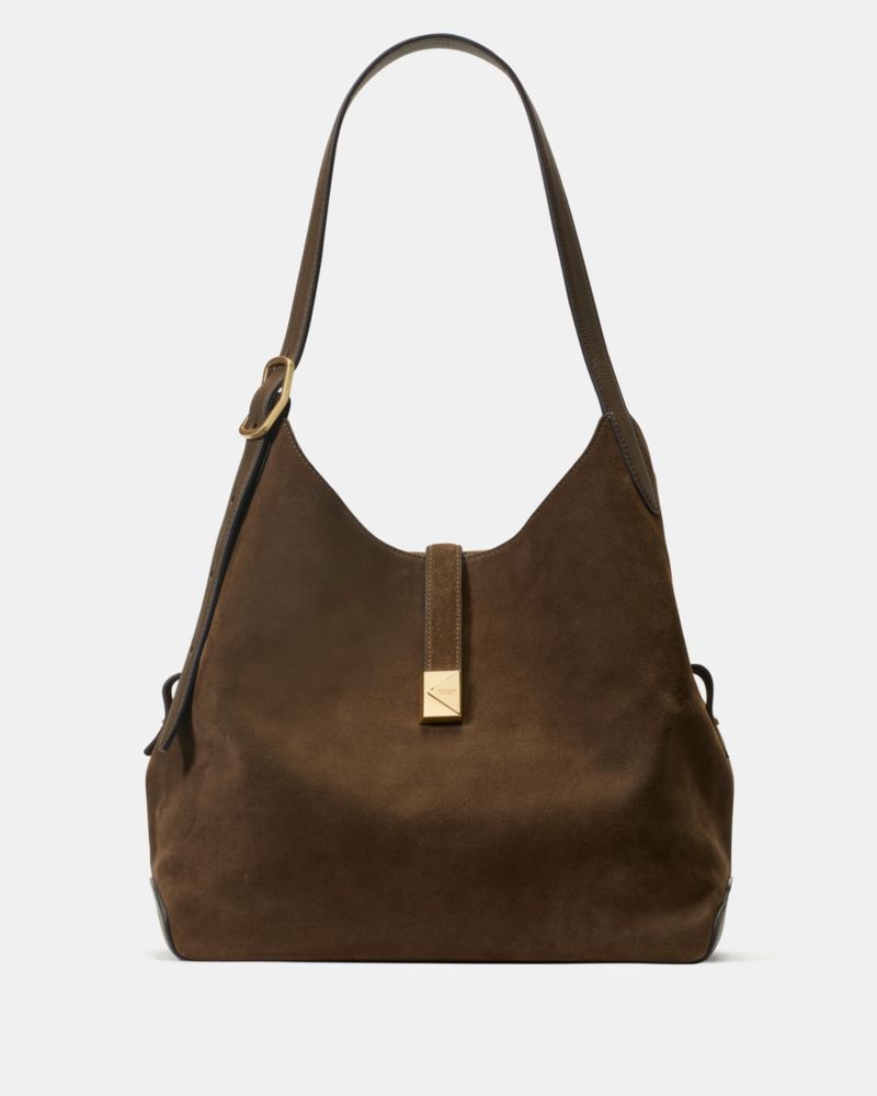 Perennially chic with luxe finishing touches, our Deco collection features elevated staples for both everyday and special occasions. This shoulder bag is made from soft suede and finished with our Art Deco-inspired K hardware.