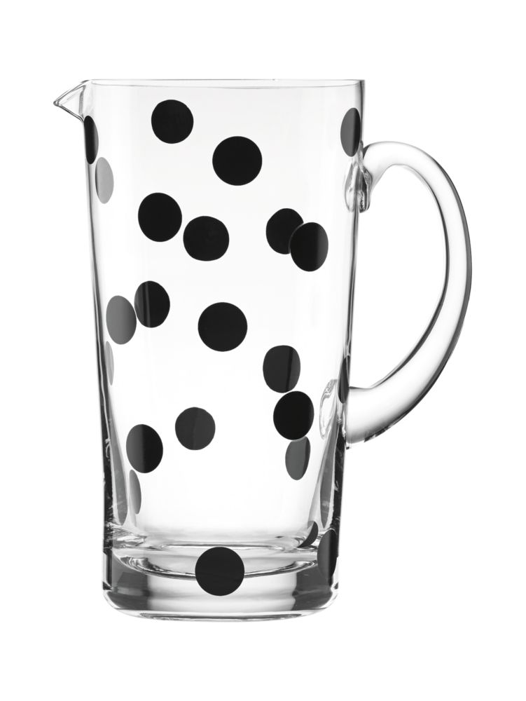 this glass pitcher, decorated with a smattering of black polka dots, is a stylish vessel for ice water, sangria or fresh-squeezed lemonade.