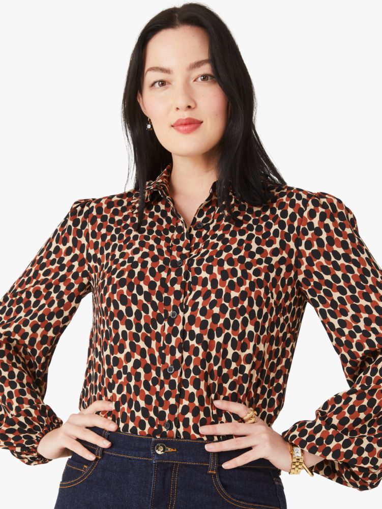 I love this blouse. I don't like ruffles but I don't mind the collar on this shirt - the ruffles add to the overall design. The dot based animal print is a welcomed staple to my wardrobe. It can be worn casual as l with jeans or business casual with a black pincer skirt.