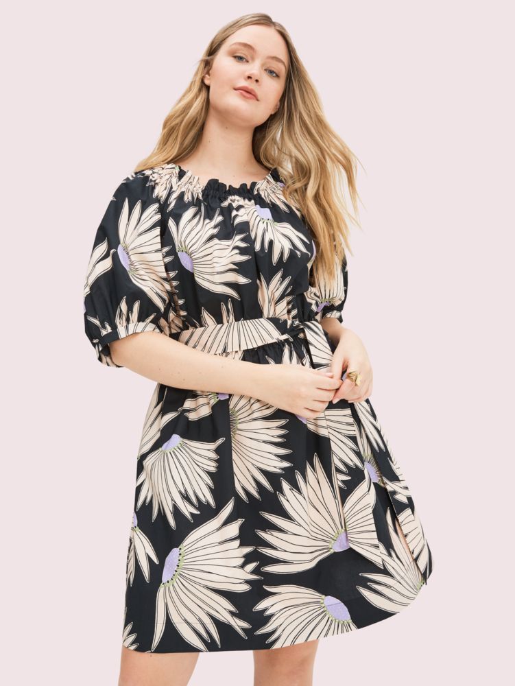if spring were a print, it would be our falling flower pattern, seen here on this cotton poplin dress. with the super flattering (and comfortable) elasticized waist and self-tie belt, you'll be wearing this mini long into summer.