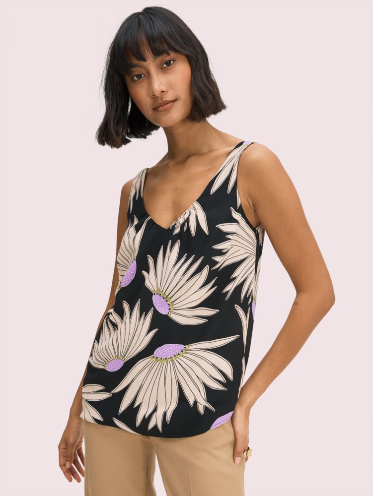 if spring were a print, it would be our falling flower pattern, seen here on this sleeveless top. with its breezy crêpe de chine, you'll be wearing this top long into summer.