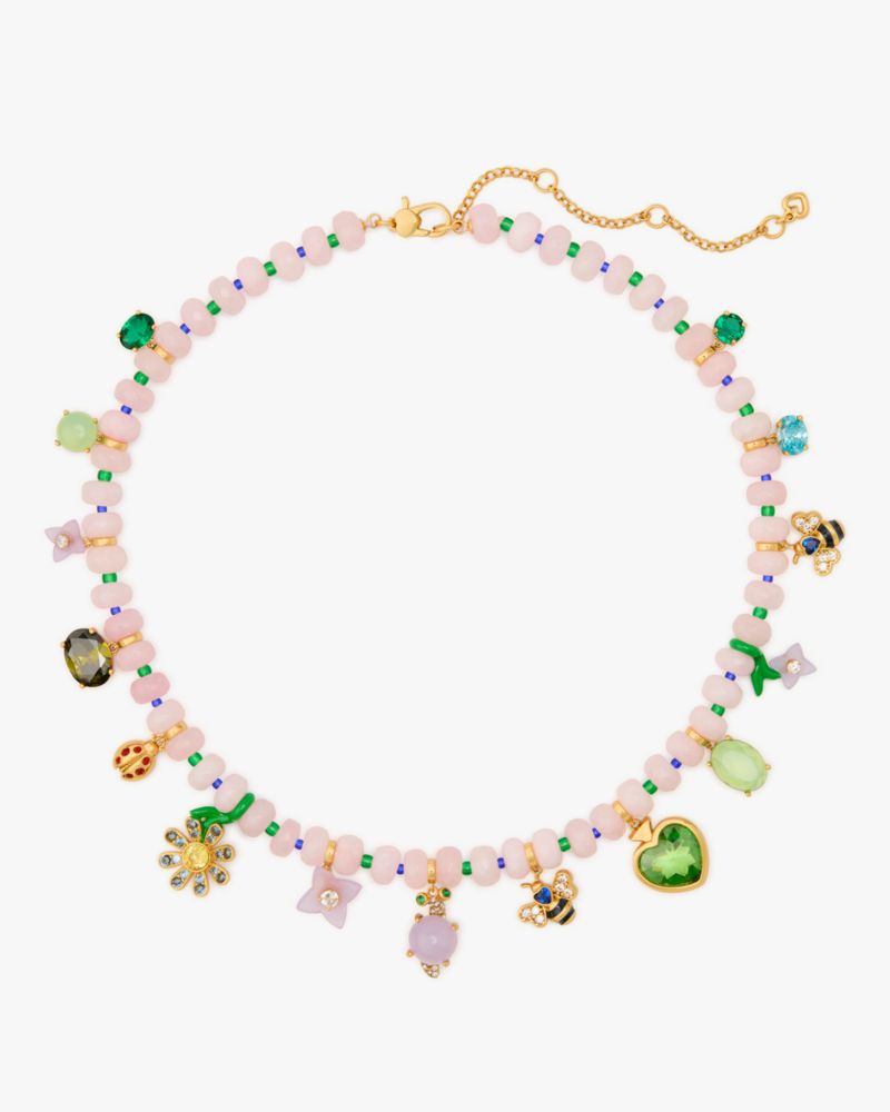 Our new beaded charm necklace features your favorite garden friends decked out in high-shine crystals.