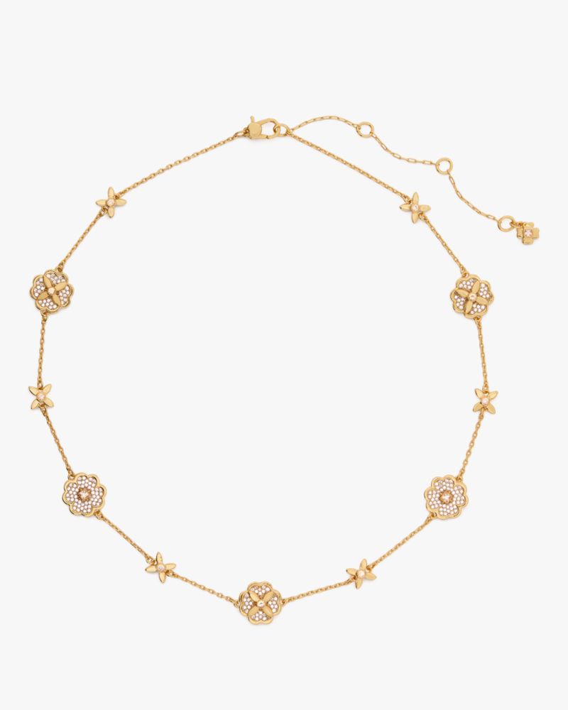 Kate Spade,Heritage Bloom Scatter Necklace,Single Strand,Rhinestones,Gold Metal,Day Party,Clear