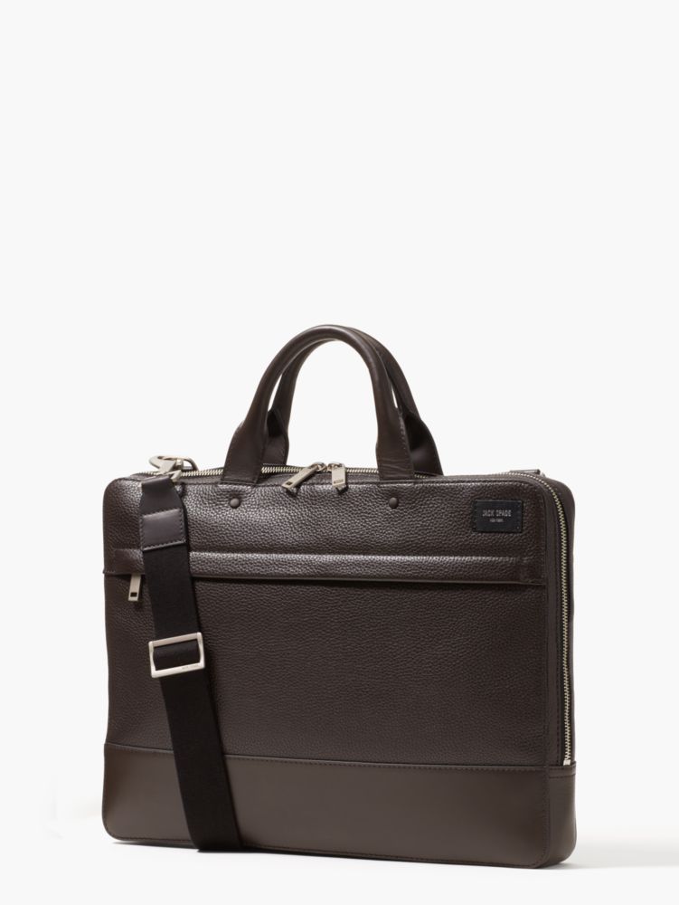 A rich, pebbled leather ensures this Jack Spade slim brief remains distinguished over time; handy details like a detachable shoulder strap, bridle leather handles, and a secure sleeve for any laptop up to 15" means you'll come out on top even on the busiest of days. Minimalist commuters and laptop warriors, this is your brief.