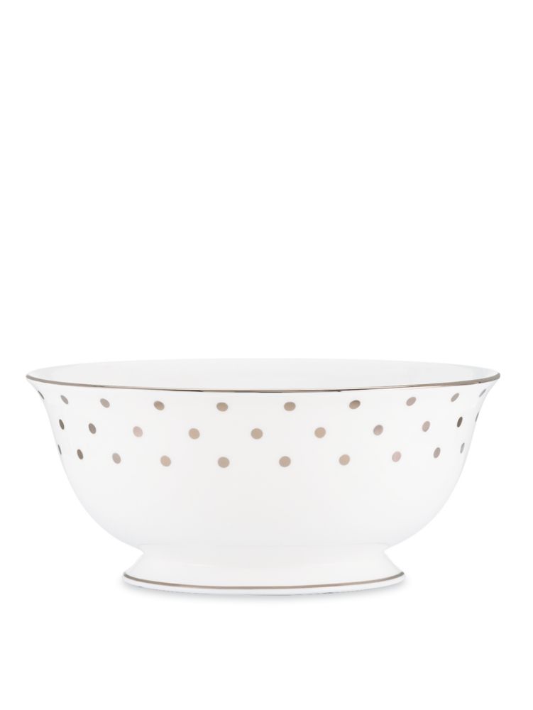 add a playful dash of polka dots to any meal with this five-piece white bone china place setting, trimmed and spotted in platinum. the set includes dinner plate, salad and dessert plate, bread and butter plate, cup and saucer.
