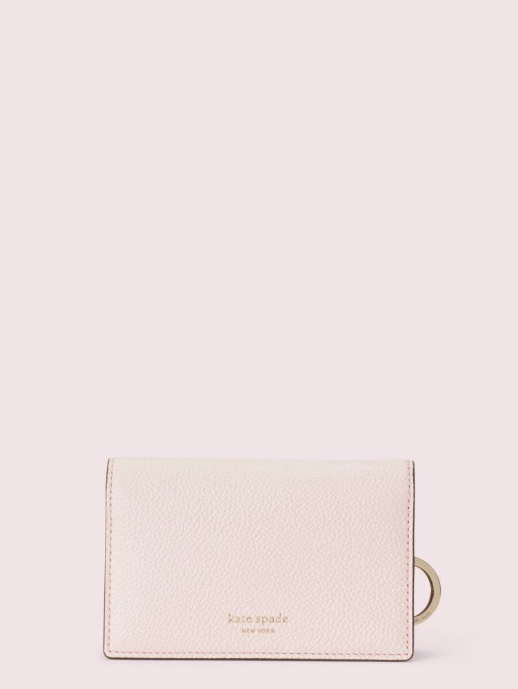 here's a way to keep all of your absolute, can't-leave-the-house-withouts in one place. our small key ring wallet has card slots, slip pockets, a zippered coin compartment and a clip for your house keys. other important details worth noting: it's made from refined grain leather and has a round slip pocket on the back is inspired by the curves of a scallop.