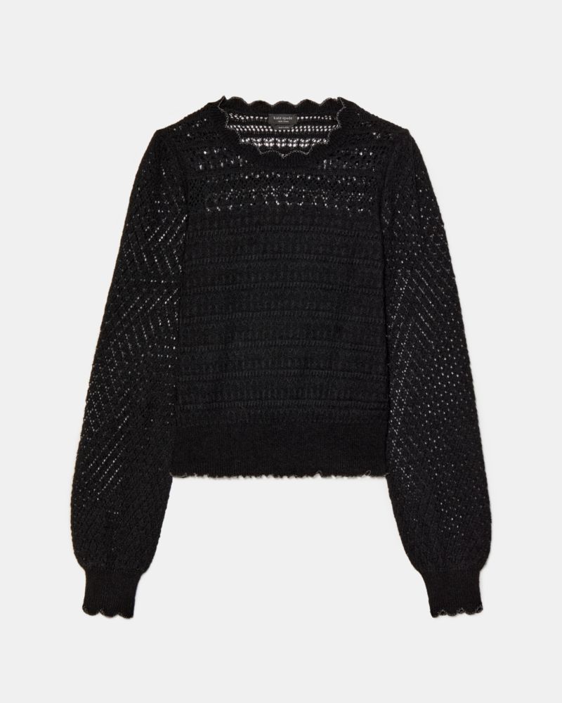 Welcome, sweater weather! This wool blend pointelle style features sweet scalloped details on its sleeves and neck.
