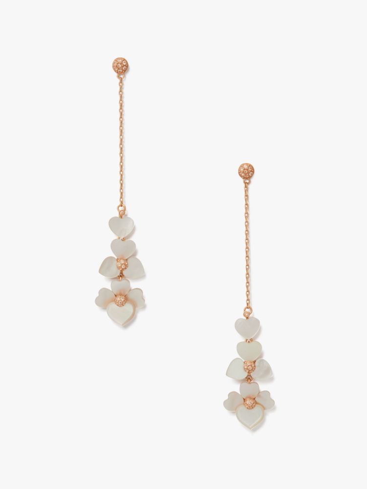 handcrafted of rose gold-tone metal and mother-of-pearl shell, our precious pansy collection is true to its name. and these linear earrings are designed with lots of thoughtful details: like the sparkly crystal centers and heart-shaped petals. did you notice the larger ones? they're a nod to our signature mark.
