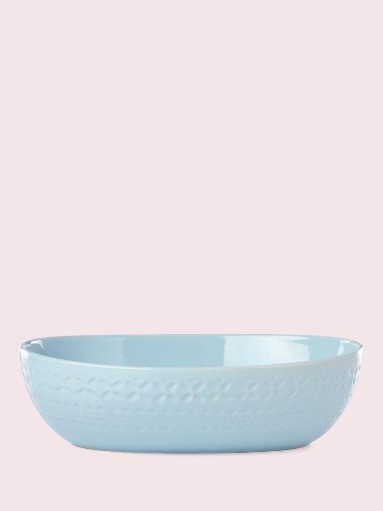 this pie dish is from our willow drive collection. it's made from glazed stoneware and has subtle, eyelet-like detail. it's so pretty, you can just slip it out of the oven and serve.